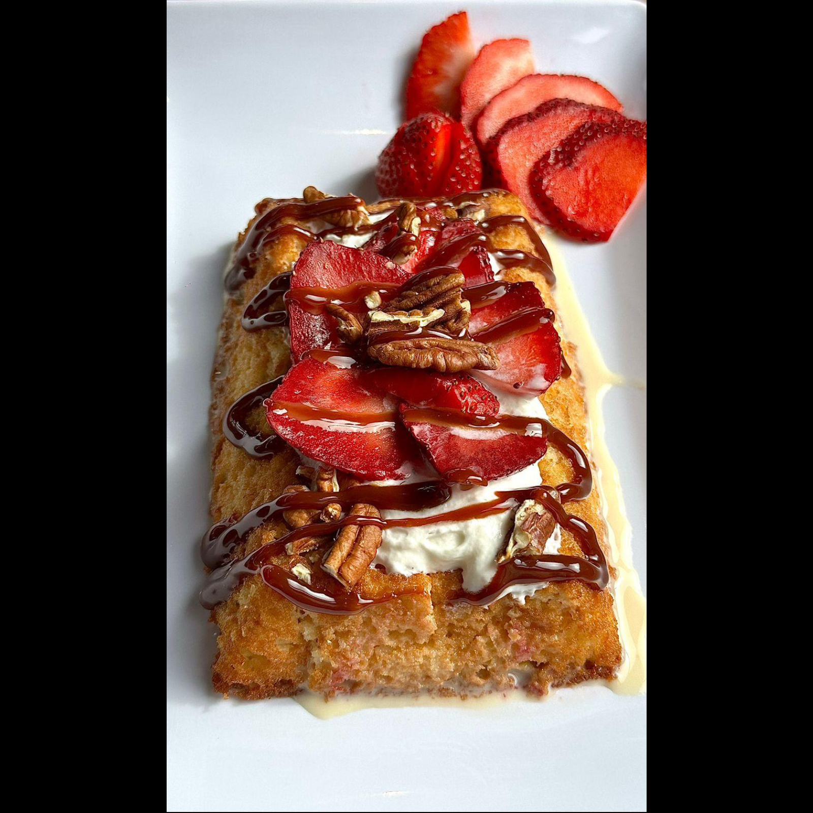 Vanilla cake soaked in a mix of three milk, topped with house whipping cream, Dulce de leche & walnuts